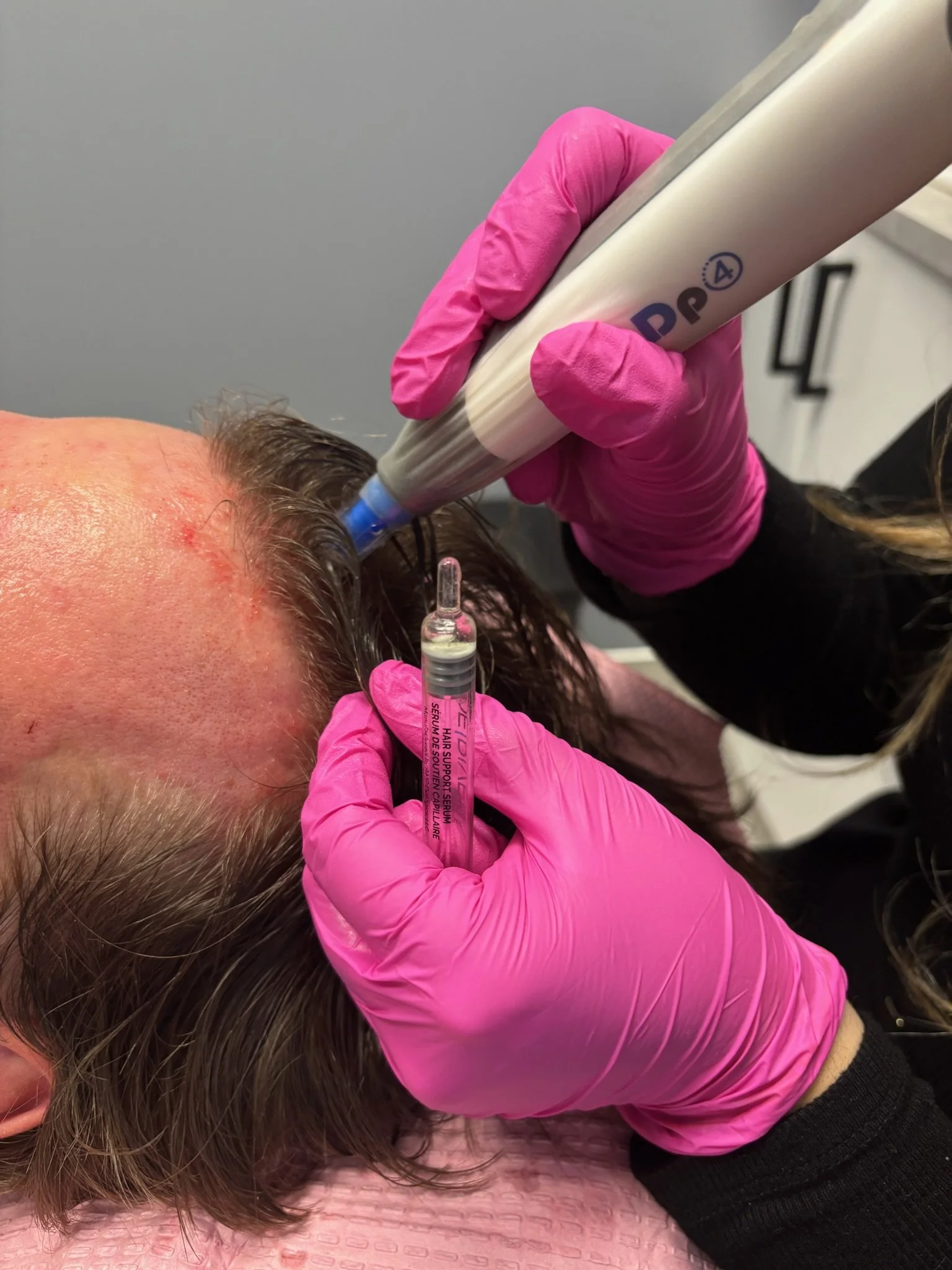 Microneedling with exosomes for hair restoration is an advanced, non-surgical treatment that combines microneedling with the power of exosomes to stimulate hair growth. During the procedure, tiny needles create micro-injuries in the scalp, promoting collagen production and improving circulation. Exosomes, specifically formulated for hair restoration, are then applied to deliver growth factors and regenerative properties directly to the hair follicles. These exosomes help accelerate healing, boost follicle activity, and encourage hair regeneration, making it an effective option for treating thinning hair and stimulating natural hair growth.